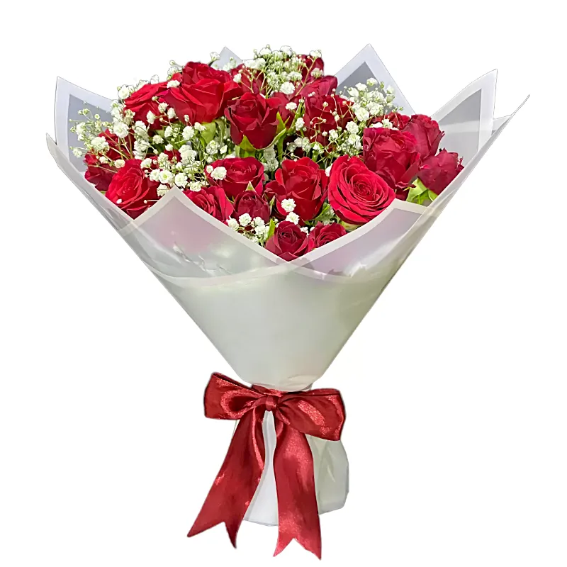Роза красная, белая гипсофила, дизайнерская упаковка.