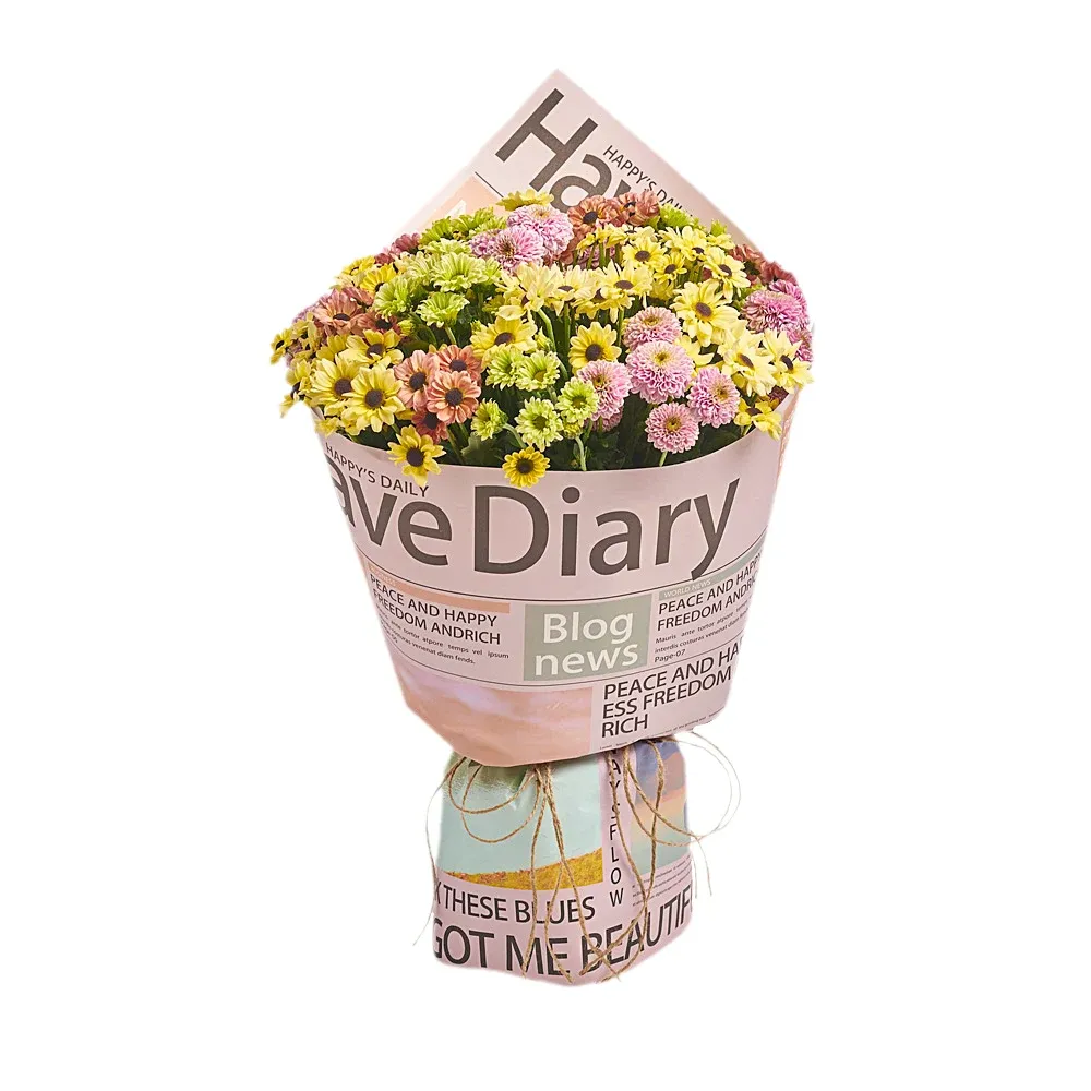 Кустовая хризантема желтая, зеленая, розовая, оранжевая, дизайнерская упаковка.
