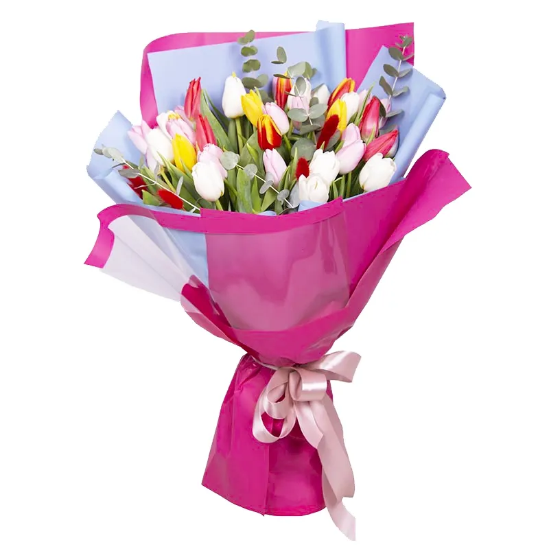 Тюльпан белый, розовый, желтый, красный, дизайнерская упаковка.
