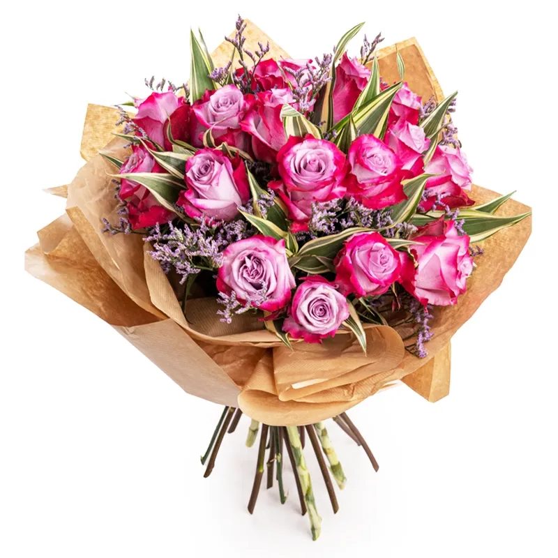 Розы фиолетовые, зелень, дизайнерская упаковка.