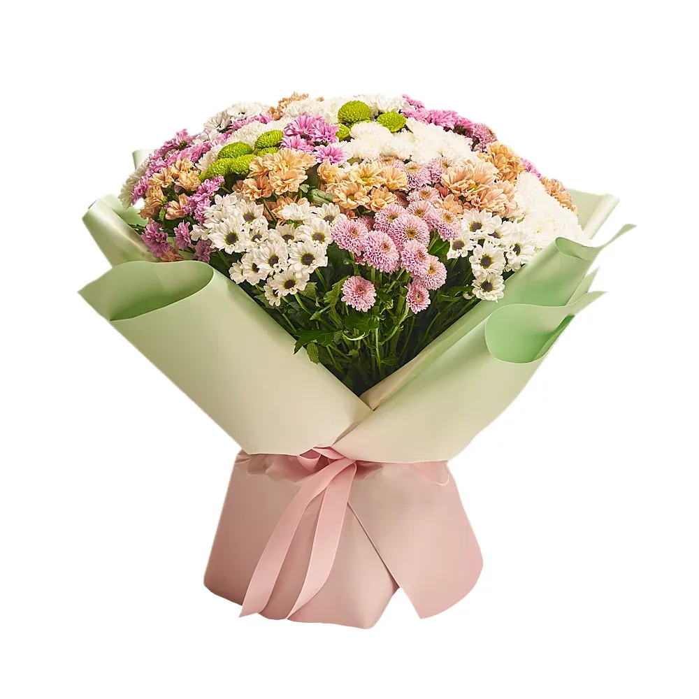 Хризантема белая, розовая, зеленая, оранжевая, дизайнерская упаковка.