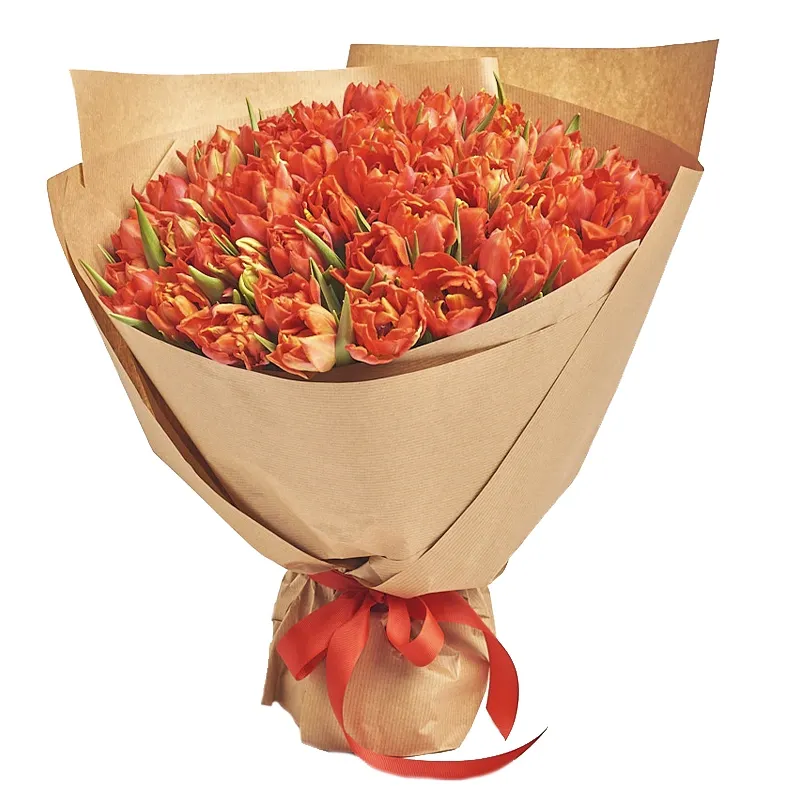Тюльпан пионовидный красный, дизайнерская упаковка.
