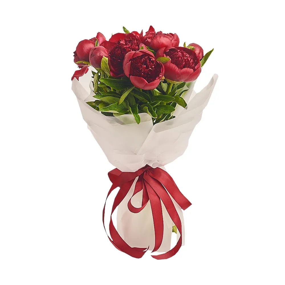 Пион бордовый, дизайнерская плёнка, атласная лента.