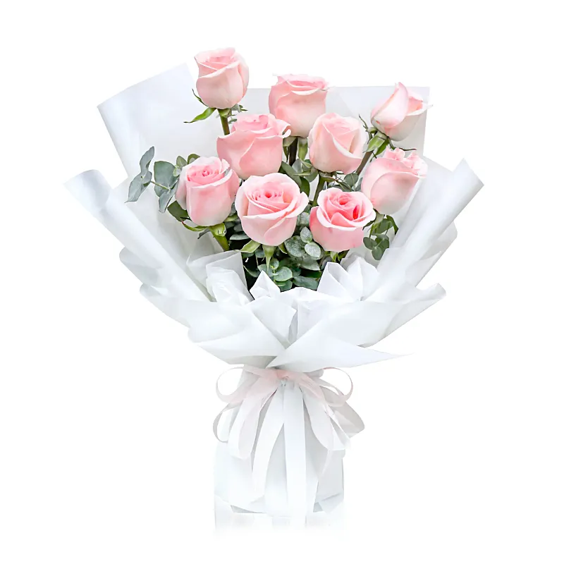 Букет из 9 розовых роз с эвкалиптом