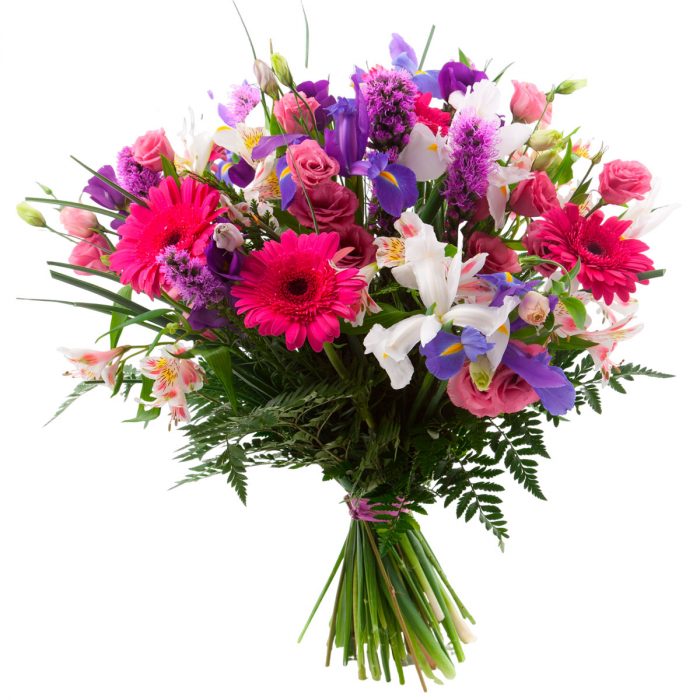 Гербера розовая, ирис белый и фиолетовый, эустома розовая, альстромерия белая, лиатрис, зелень. Упаковка (лента, пленка, крафт, сетка, пленка матовая)