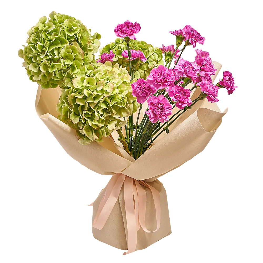 Диантус розовый, гортензия зеленая, дизайнерская упаковка.