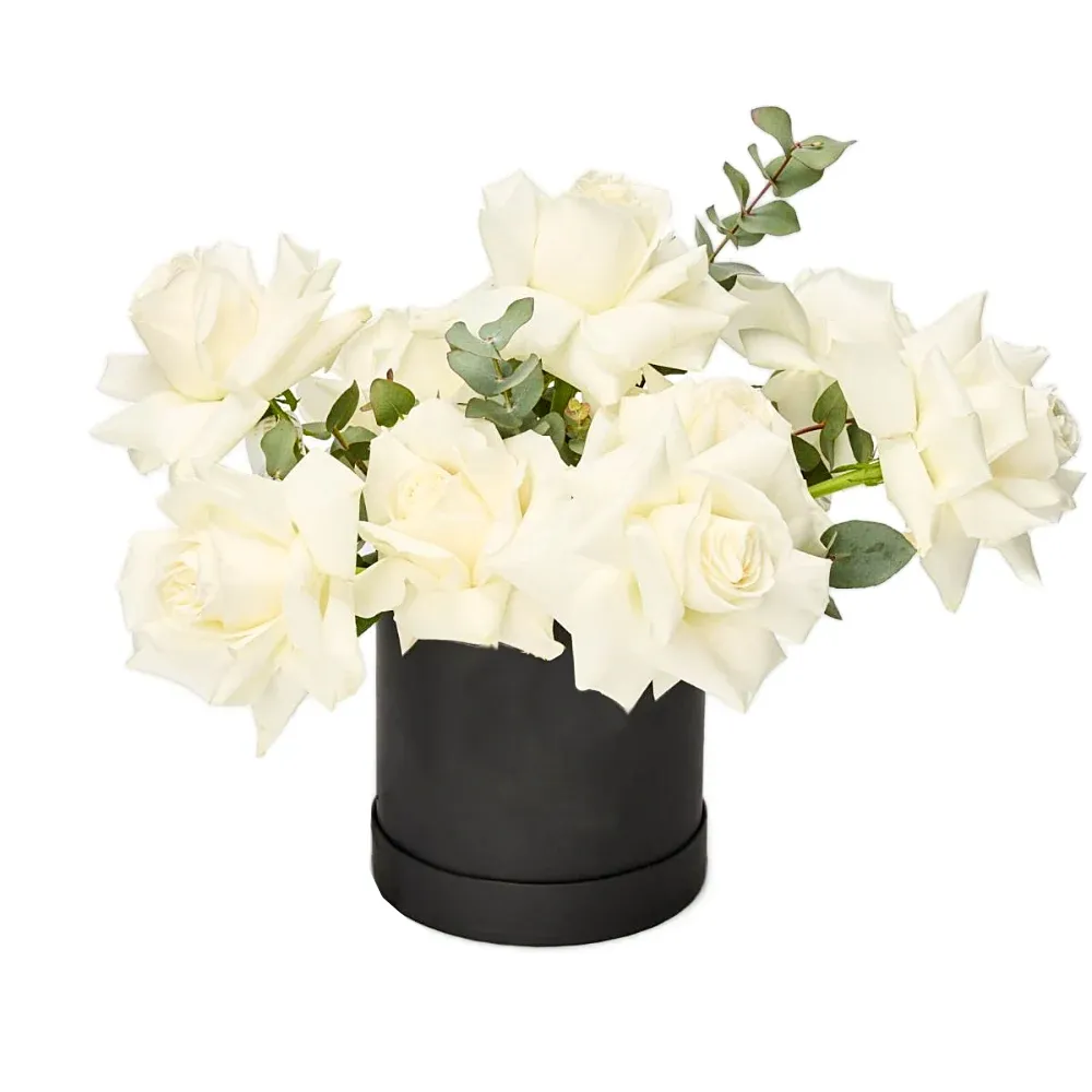 Вывернутая белая роза, эвкалипт, оазис, шляпная коробка.