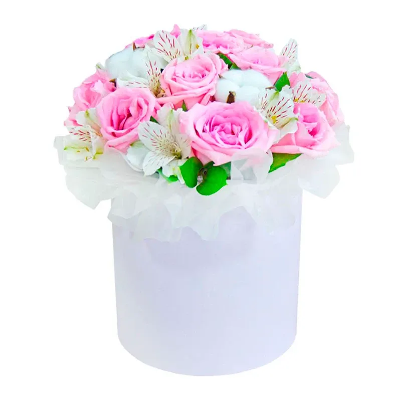 Роза одноголовая розовая, альстромерия, хлопок, оазис, шляпная коробка.