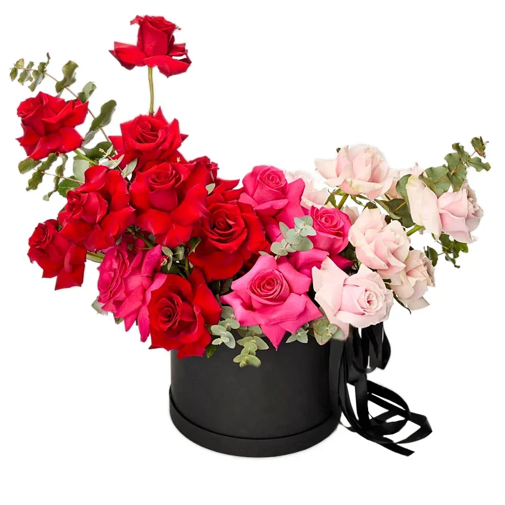 Французская роза красная, розовая, нежно-розовая, веточки эвкалипта, оазис, шляпная коробка.