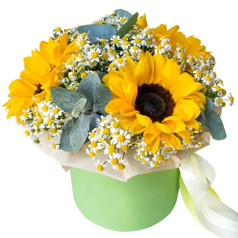 Подсолнух, кустовая ромашка, эвкалипт, оазис, шляпная коробка.
