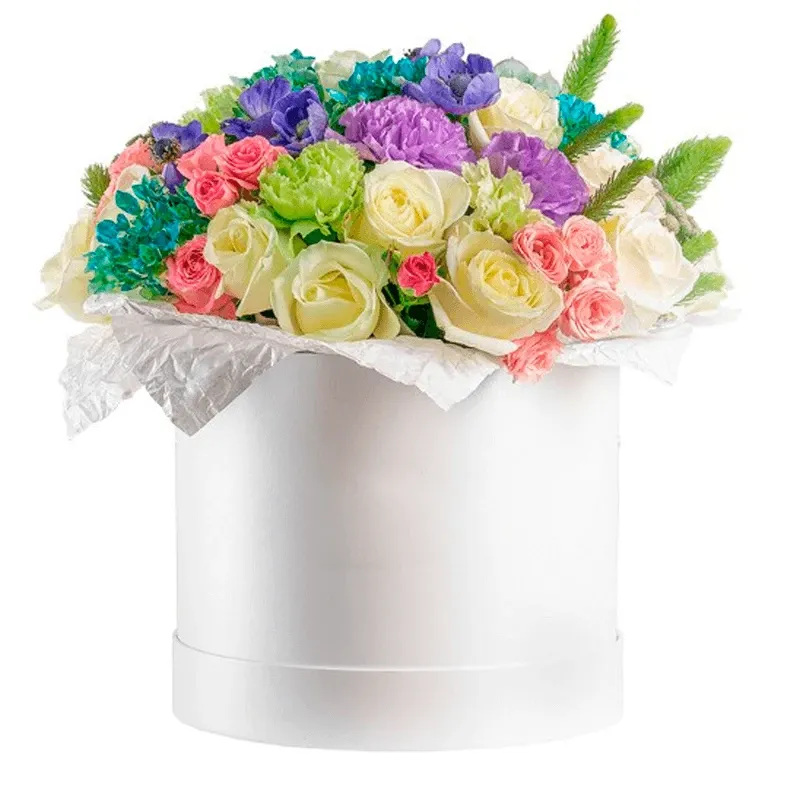 Кустовая роза, роза одноголовая, гвоздика, каллы, оазис, шляпная коробка.