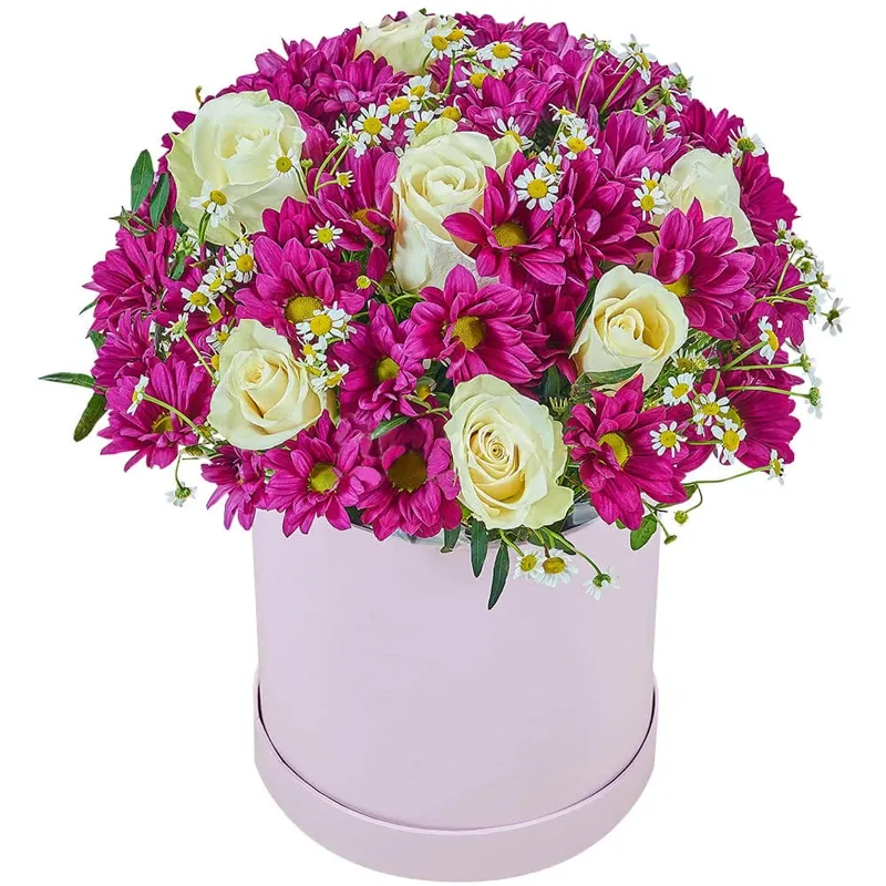 Хризантема кустовая, роза одноголовая, оазис, шляпная коробка.