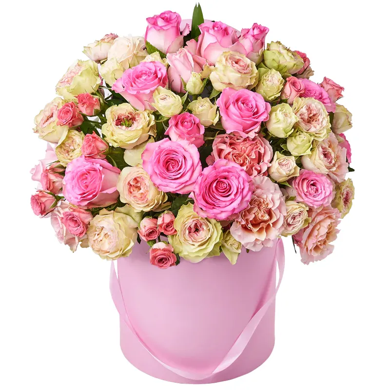 Роза одноголовая, роза кустовая, роза пионовидная, оазис, шляпная коробка.