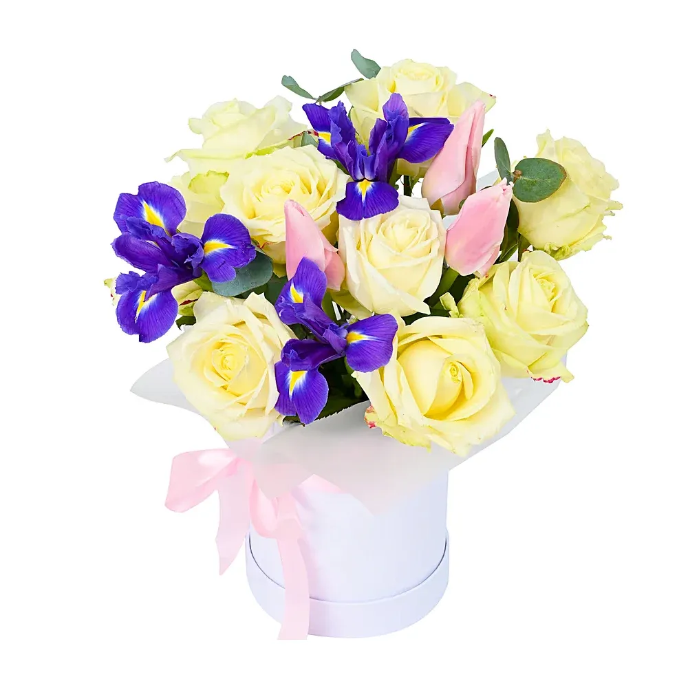 Роза белая, ирис, розовый тюльпан, эвкалипт, оазис, шляпная коробка.