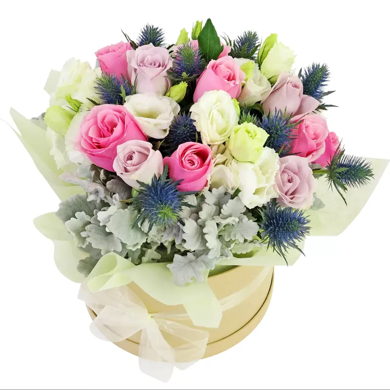 Роза, эустома, эрингиум, цинерария, оазис, шляпная коробка.