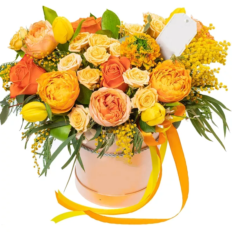 Роза кустовая, роза пионовидная, мимоза, цветочный декор оазис, шляпная коробка.