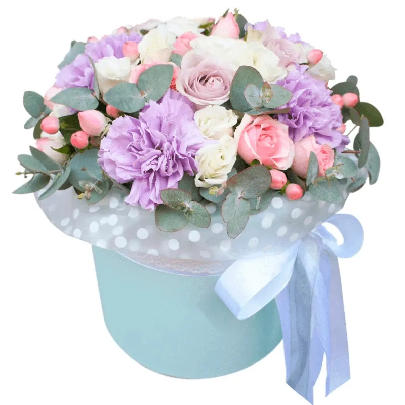 Кустовая роза, гвоздика, эвкалипт, гиперикум, оазис, шляпная коробка.