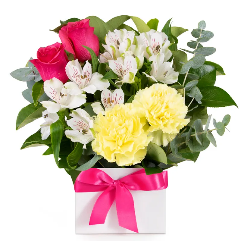 Роза одноголовая розовая, альстромерия белая, гвоздика желтая, эвкалипт, дизайнерская упаковка.