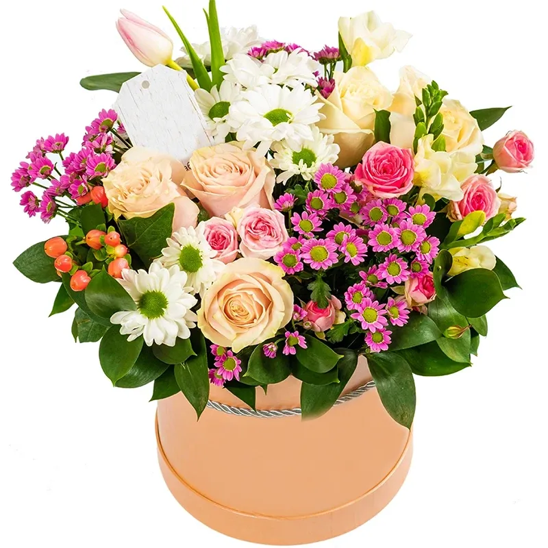 Роза одноголовая, хризантема, роза кустовая, тюльпаны, гиперкум, оазис, шляпная коробка.