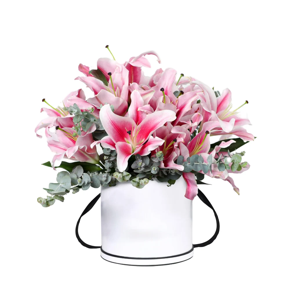 Лилия розовая, эвкалипт, оазис, шляпная коробка.