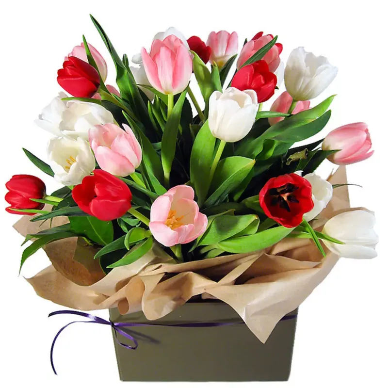 Тюльпан красный, розовый, белый, оазис, шляпная коробка.