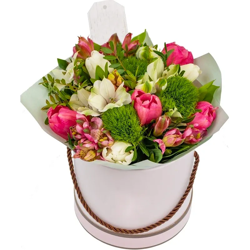 Тюльпан розовый, альстромерия микс, зелень, оазис, шляпная коробка.
