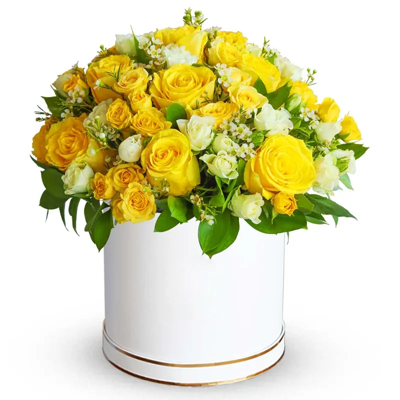 Роза желтая, кустовая роза, зелень, оазис, шляпная коробка.