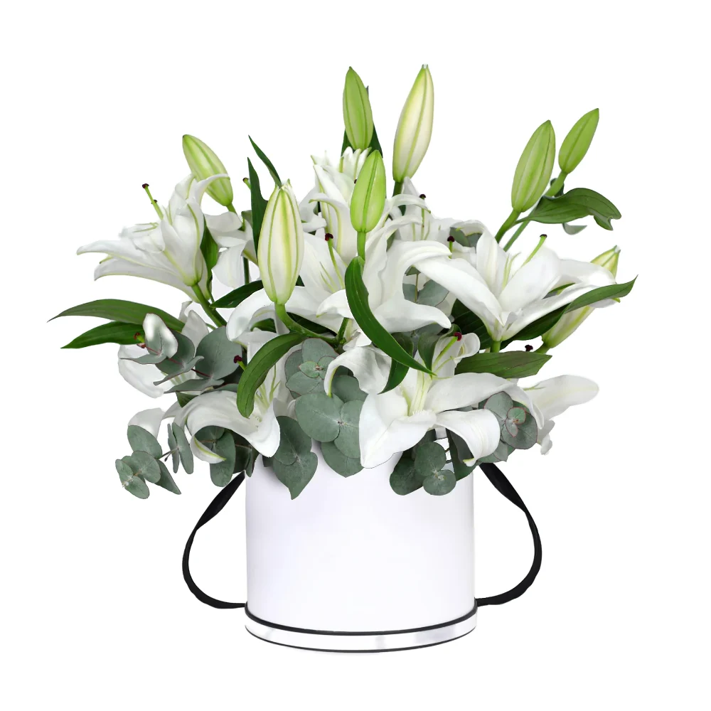 Белая лилия, эвкалипт, оазис, шляпная коробка.